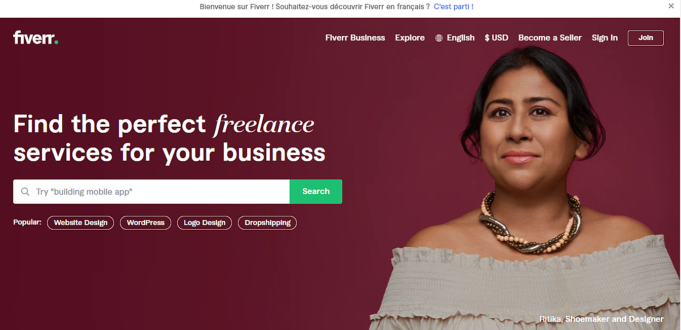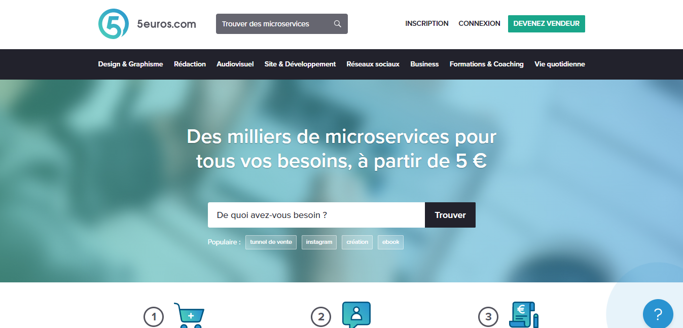 Fiverr est un marché sur le net, pour les travailleurs indépendants. Vous pouvez y vendre tout type de service. Fiverr propose de nombreuses missions à partir de 5 $. Il peut s’agir d’une mission simple comme rédiger une annonce publicitaire ou complexe comme la définition d’une charte graphique, la réalisation d’un site web ou des affiches et logo pour la présentation des produits d’une entreprise… Faites-y un tour.