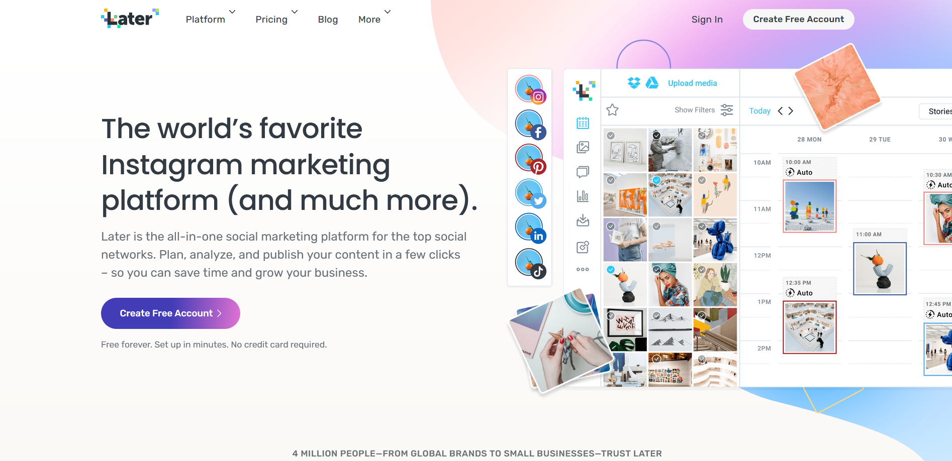 Later est une plate-forme de marketing social pour les meilleurs réseaux sociaux à savoir Instagram, Facebook, Twitter, Pinterest… Elle vous permet de pouvoir faire une planification, une analyse pour la publication de vos contenus. Later permet au Community Manager de gagner en temps et en efficacité. Ces fonctionnalités tournent principalement autour de la planification visuelle, la gestion des médias, le marketing et l’analyse. Faites-y un tour pour voir ce qu’il en est.